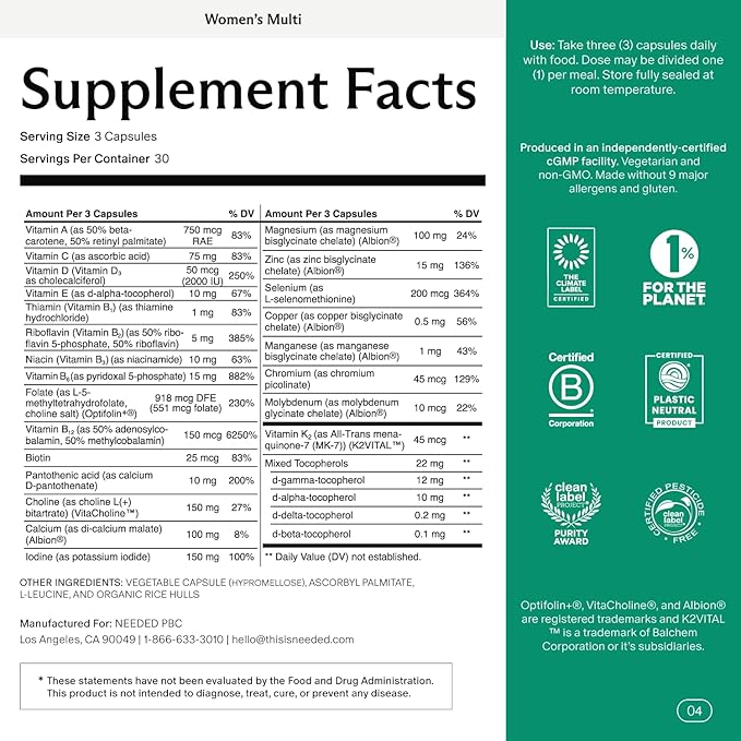 Needed. Multivitamin for Women with 23 Vitamins, Minerals and Antioxidants - Daily Womens Multivitamin - Vitamin B12, B6, D3, Choline, Calcium, Biotin, Magnesium, Folate and More (90 Count)