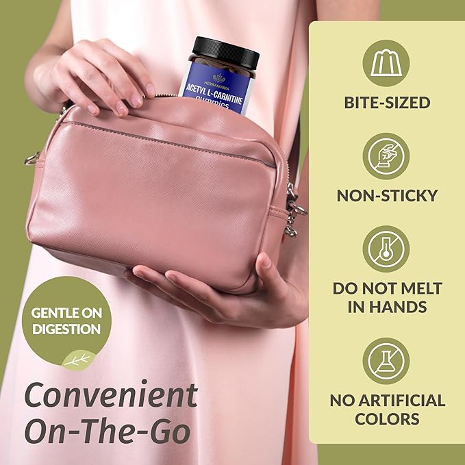 - Convenient On-the-Go: Enjoy the ease of bite-sized Carnitine for women supplement. Herbamama pectin-based focus support chews are coated with tapioca to prevent sticking and are designed to resist melting, even in hot weather or when held in your hands.