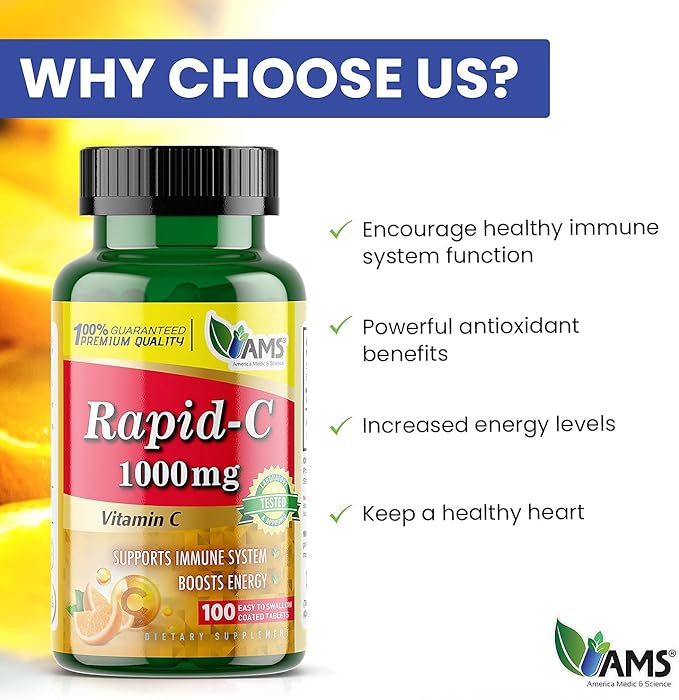 - STRENGTHENS YOUR IMMUNITY: If you’re searching for a great supplement with all-around immune support, look no further! AMS Rapid-C contains 1000 mg of vitamin C that helps power up your immune system. Taking our ascorbic acid tablets may help your body to naturally combat common health problems.