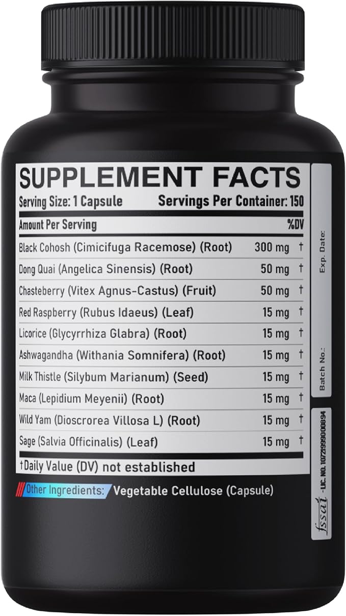 12in1 Black Cohosh 5-Month Supply for Menopause Support Supplement with Dong Quai, Chasteberry, Red Raspberry, Licorice, Wild Yam & More - 150 Capsules