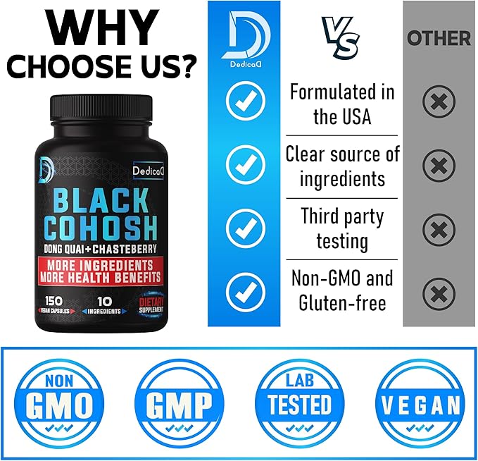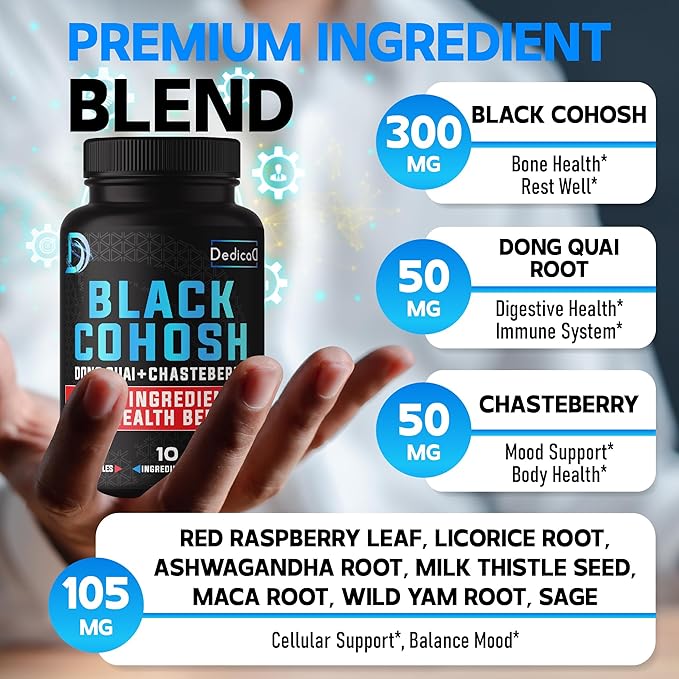 - š Dedicad Menopause Black Cohosh Complex has the potential to support menopausal symptoms, a positive mood, smooth skin, and bone health; A great choice for you if you're looking for a natural way to improve your overall well-being.