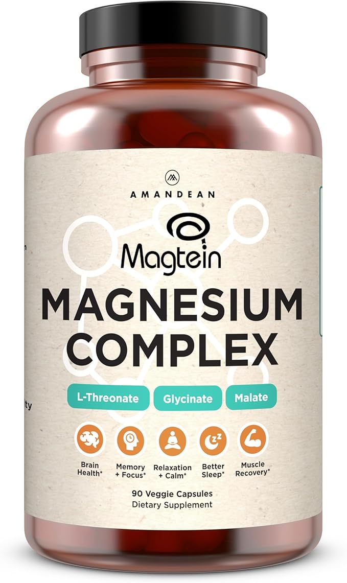AMANDEAN Magtein Magnesium Complex. L-Threonate, Glycinate, Malate Triple Blend Chelated Magnesium Supplement. 90 Veggie Capsules. High Absorption Branded Ingredients. Brain Health, Sleep, Calm*.