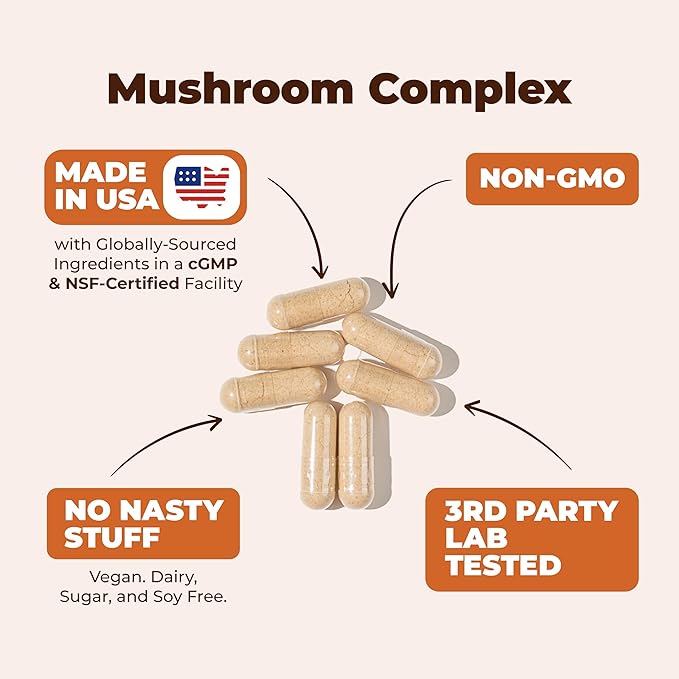 - PREMIUM SUPPLEMENT YOU CAN TRUST. Our Complete Mushroom Complex with Lion's Mane is made in the USA in a cGMP-Certified & NSF-Certified Facility. Globally-Sourced ingredients. Non-GMO. Vegan. Free from Dairy, Sugar, & Soy. Convenient flip-top bottle.