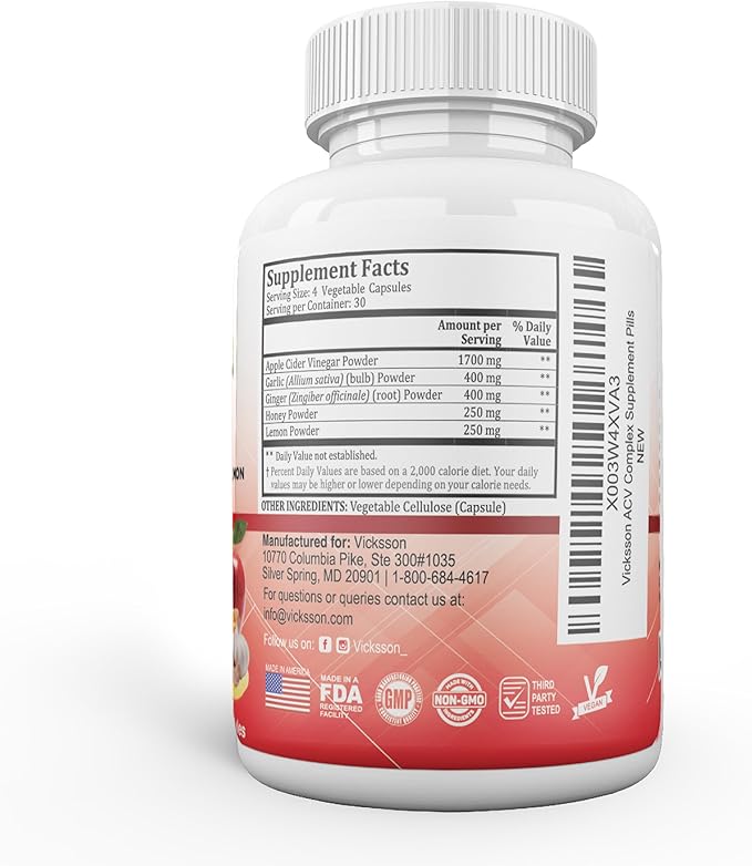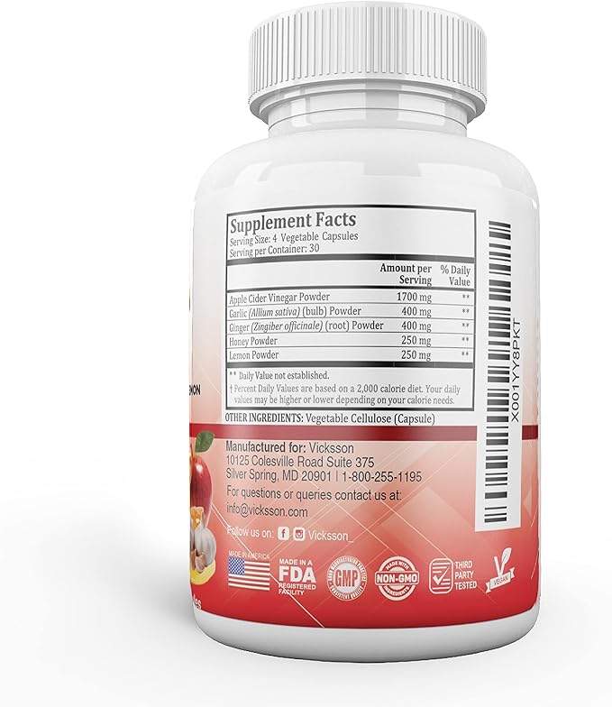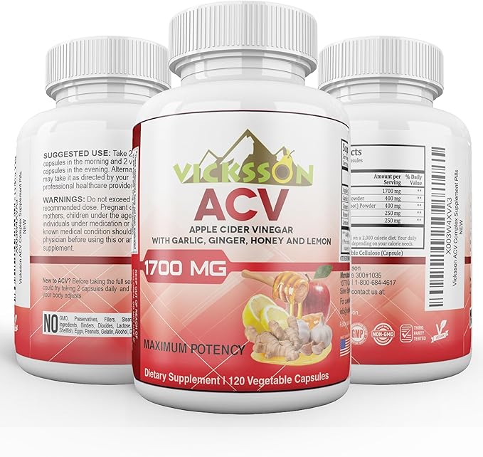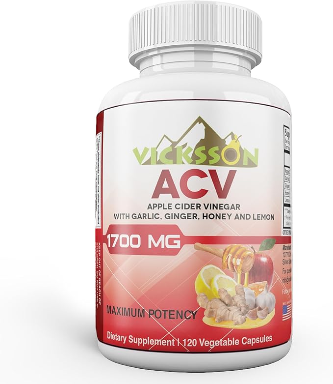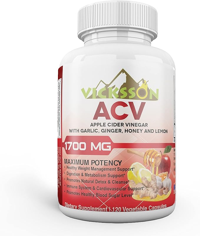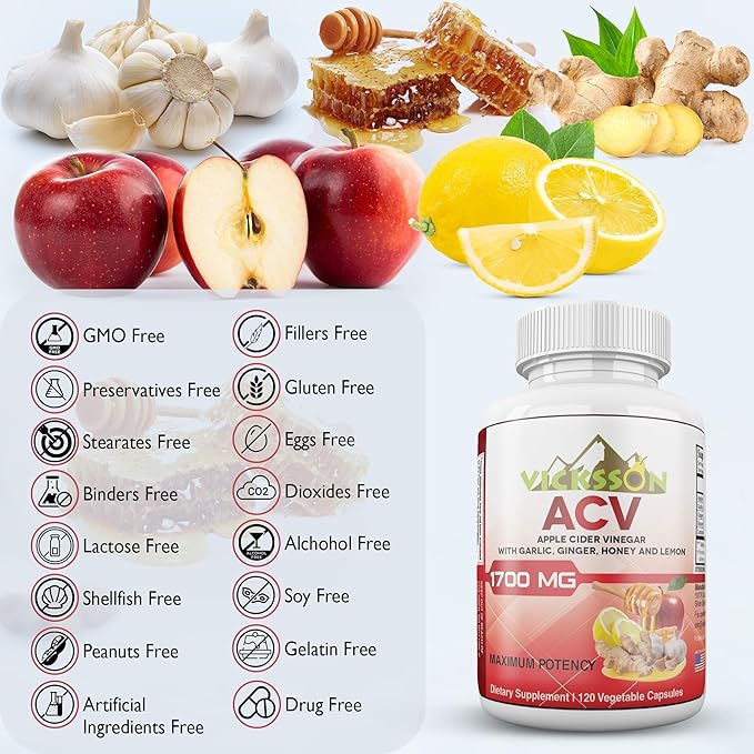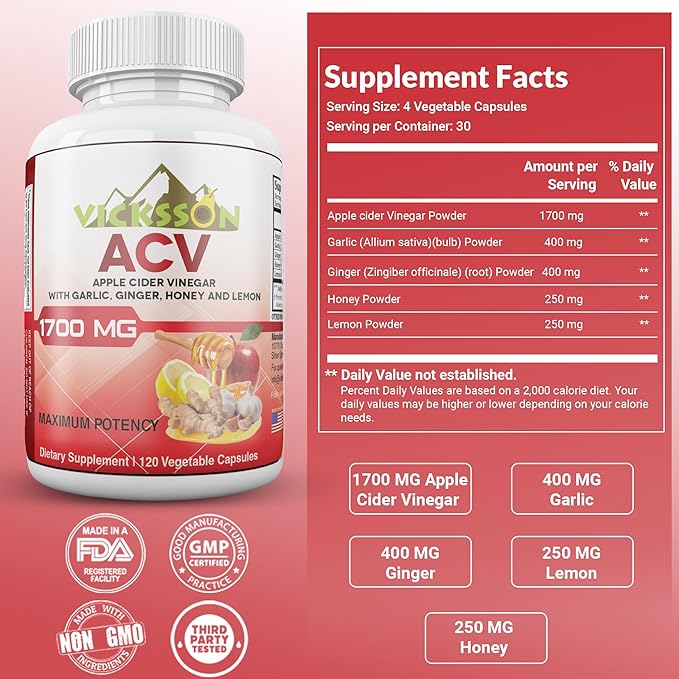 Vicksson Apple Cider Vinegar Pills 1700 mg of ACV with Garlic, Ginger, Lemon & Honey for Weight, Detox, Cleanse, Appetite, Bloating, Metabolism & Immune Support | 120 Capsules