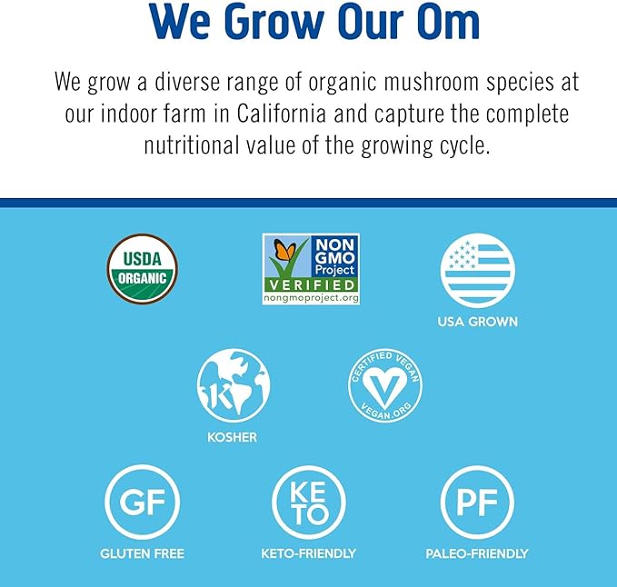 - USA Grown the Om Way: Om Mushroom Superfood Powders, Capsules, Gummies, and Functional Beverages are all produced in the USA. We grow, steam, dry and mill our organic mushrooms into powders in our state of the art facilities in Southern California to ensure the highest quality, and verify using 3rd-party testing. Om Mushroom powders are USDA Certified organic, non-GMO, gluten-free, vegan, grown in the USA, paleo-friendly, keto-friendly, kosher
