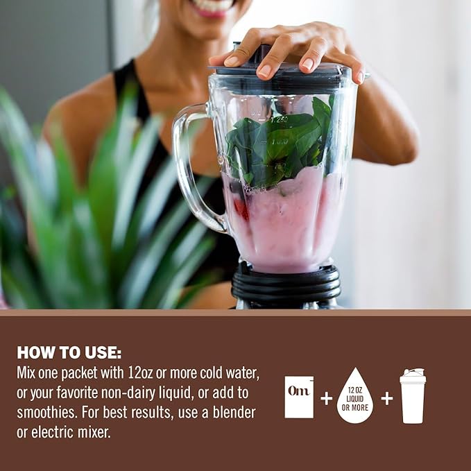 OM MUSHROOM SUPERFOOD Master Blend Mushrooms & Adaptogens, Creamy Chocolate Plant Protein, Single Serve, 10 Count, 10 Mushroom Complex, Lion's Mane, Ashwagandha, Stress Relief, GLP-1 Support