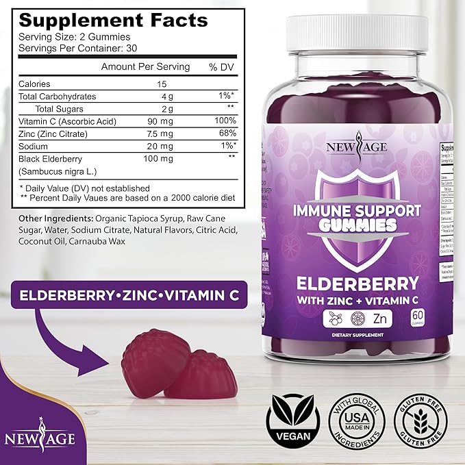 - Delicious Immunity Support Gummies Boost - New Age combines sambucus elderberry, a potent antioxidant extract that helps support immune system health, with immunity boosters vitamin C and zinc to create your go-to, 3-in-1 immunity boosting elderberry gummies.