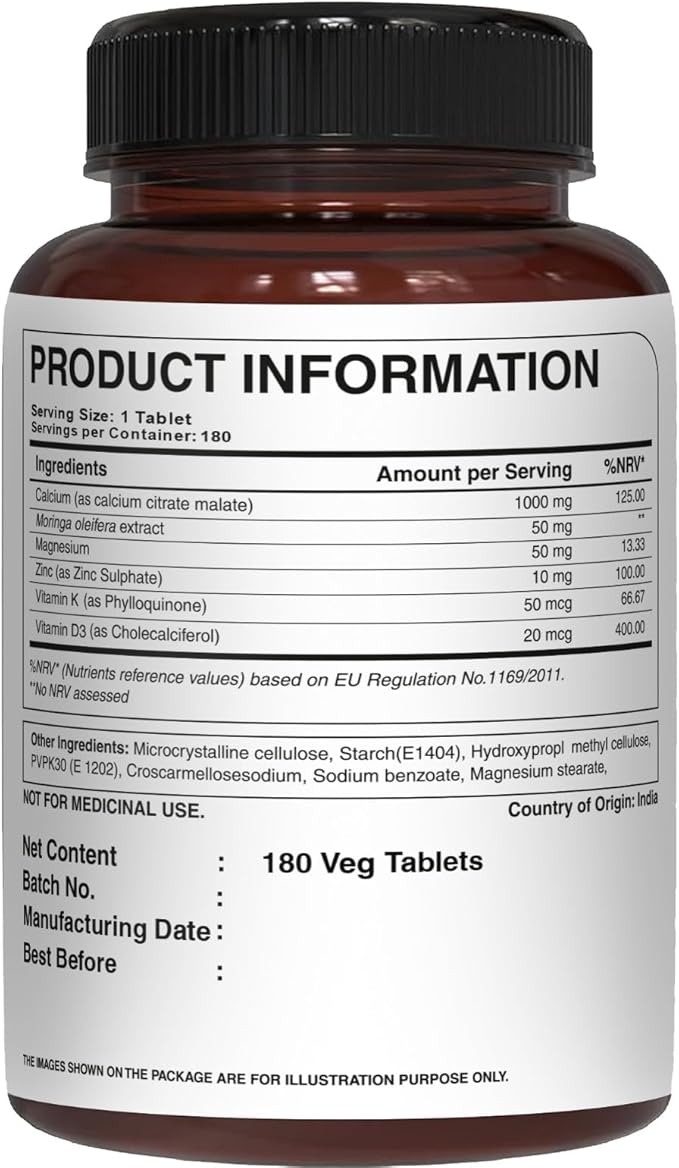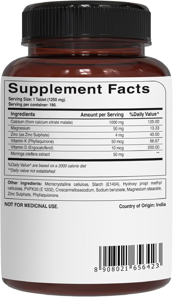 - Every tablet of 1250mg provide 1000 mg Calcium Citrate Malate, 50 mg Moringa, 50 mg Magnesium oxide and 400 IU Vitamin D