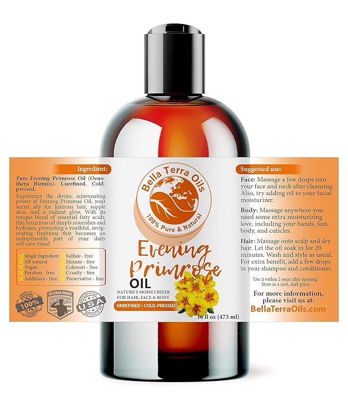 Bella Terra Oils - Organic Evening Primrose Oil 16oz - Discover the Cold-Pressed Excellence of Primrose, Loaded with Essential Nutrients & Omega-6, Distinct Elixir for Luminous Skin