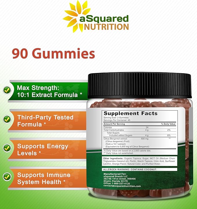 - EXTRA STRENGTH: With 500mg of 10:1 concentrated Citrus Bergamot extract per serving, you get the equivalent of 5,000mg of Citrus Bergamot per serving (2 gummies). Citrus Bergamot supplementation is most convenient in gummy form, but is also found in capsules, drops, tablets, liquid, tea, oil, and powder. Citrus Bergamot may support increased energy levels, promote brain health, and support immune system health.