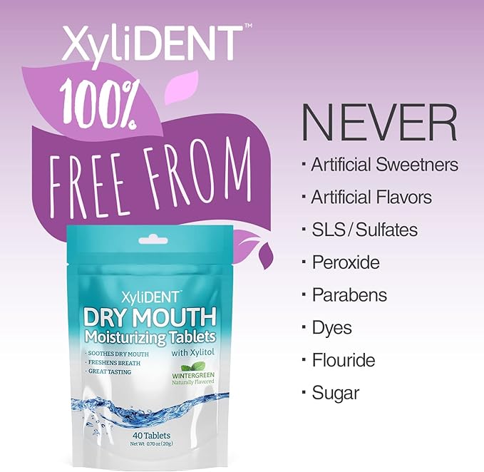 - ALL NATURAL - XyliDENT Dry Mouth Tablets are sugar-free and get their sweet taste from Xylitol. They contain natural Xylitol, no animal products, protein, artificial colors, or preservatives and have zero calories and zero carbs!