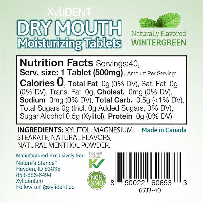 Nature's Stance XyliDENT Xylitol Tablets for Dry Mouth Relief - Stimulates Saliva, Freshens Breath, Reduces Acid Production, Fast Acting Relief, 40 Count (Wintergreen)