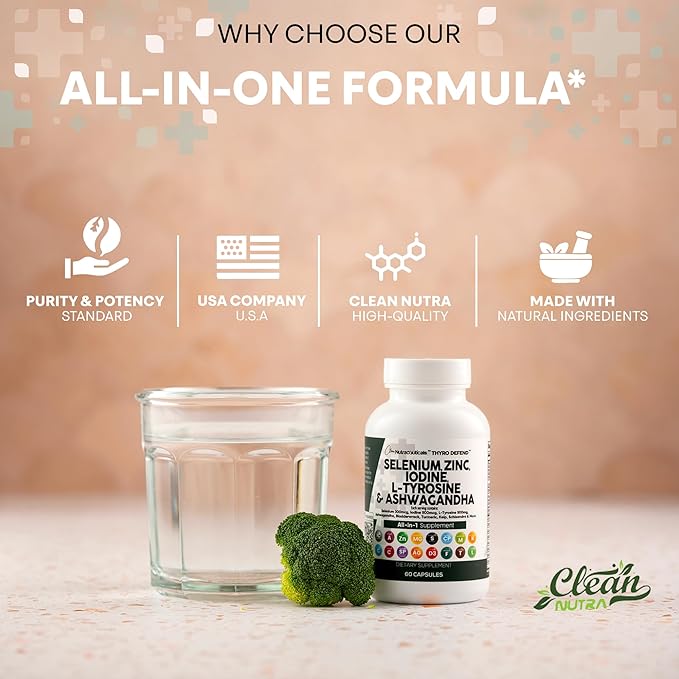 - All-In-1 Thyroid Support Selenium Supplement & Potassium Iodide Complex for Women and Men - Our product takes selenium and zinc supplements and combines them with potassium iodine, l-tyrosine supplement, and ashwagandha capsules and the results are amazing. Normal thyroid vitamins and supplements contain selenium 200mcg. However, Clean Nutra has officially created an even more potent all in one thyroid supplement.
