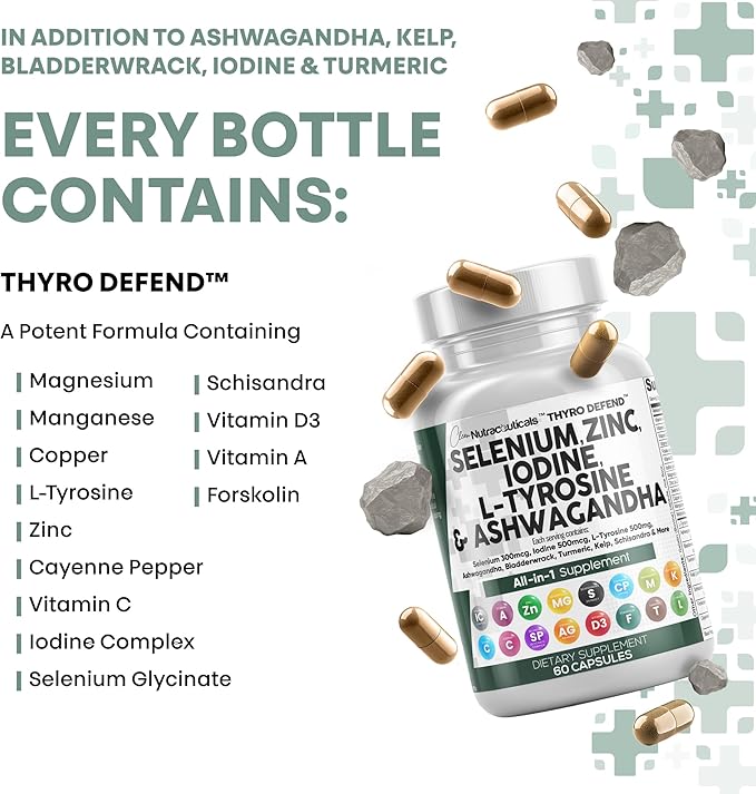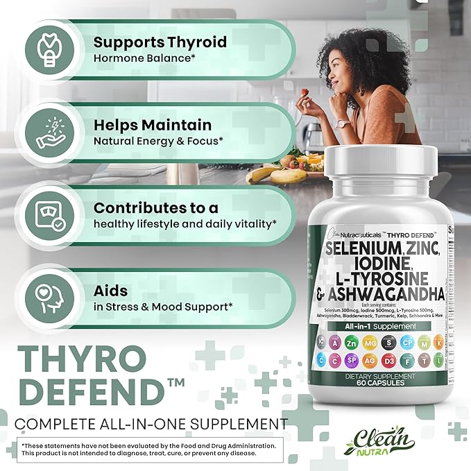 - The Ultimate Thyroid Supplement & Iodine Supplement You've Been Looking For - Clean Nutra ThyroDefend provides 5 full-dose products in one thyroid support complex containing a full zinc supplement, iodine supplements for thyroid, selenium supplements, tyrosine powder, and ashwagandha supplements in a convenient 2 capsule dosage. Finally, iodine pills, zinc 50 mg and an ashwagandha supplement have been packed into one convenient solution.