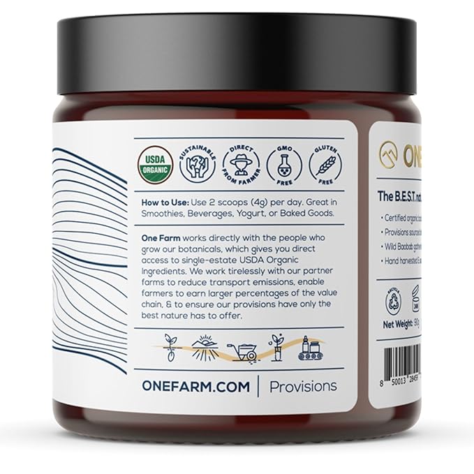 - TRANSPARENCY & SUSTAINABILITY: All of One Farm's superfood powders use only whole botanical ingredients, are made with ingredients sourced directly from organic farms using sustainable practices, and are promoted with complete transparency. You'll always know how it’s made, exactly what is in it, and where those ingredients come from.