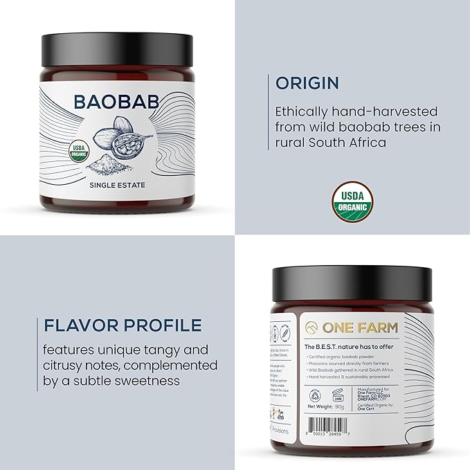 - FROM THE FARM: We source all of our organic ingredients directly from the farmers who grow them. Our Baobab powder is gathered from wild baobab in rural South Africa.