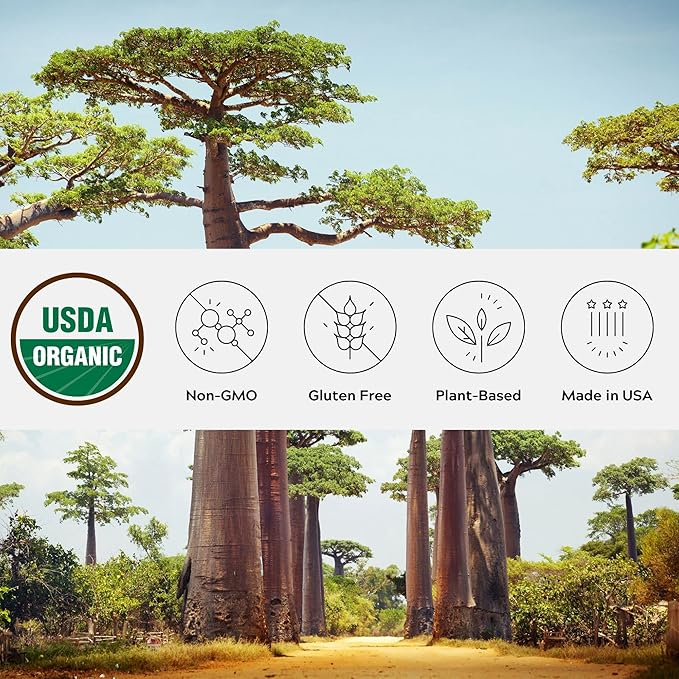 - 100% ORGANIC BAOBAB POWDER: USDA Certified Organic, hand-harvested, and sustainably processed Baobab powder. Fair Trade Certified Baobab sourced and processed directly from the farmers who grow it.