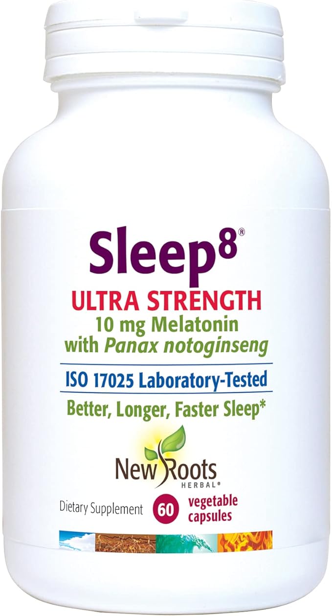 NEW ROOTS HERBAL Natural Sleep Supplement, 8-in-1 Ultra-Strenth Formula with Passion Flower, Chamomile, Hops, Panax Gingseng, Skullcap, Magnesium, 10 mg Melatonin (60 Veg Caps)