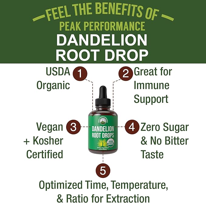 - Powerful Yet Gentle - Peak Performance USDA Organic Dandelion Root Extract Drops is a detox and cleanse supplement for women and men. This formula can help promote immune health + acts as a gut and liver cleanse for optimal digestion and well-being. You get the highest quality ingredients we could find. We created a balanced, absorbable formula with optimized time, temperature, and ratio for extraction.