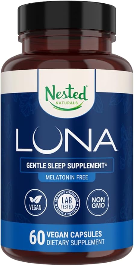 Nested Naturals Luna Sleep Supplement, Melatonin Free, Non-Habit Forming Herbal Sleep Supplement, Adult Bedtime Support, Help Sleeping w/Chamomile, Valerian, L-Theanine, 60 Vegan Capsules