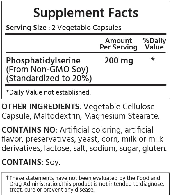 - Phosphatidylserine 200 mg: Each serving provides a standardized 200 mg dose, crafted with naturally derived ingredients to ensure exceptional purity, bioavailability, and absorption. This product is also certified Non-GMO.