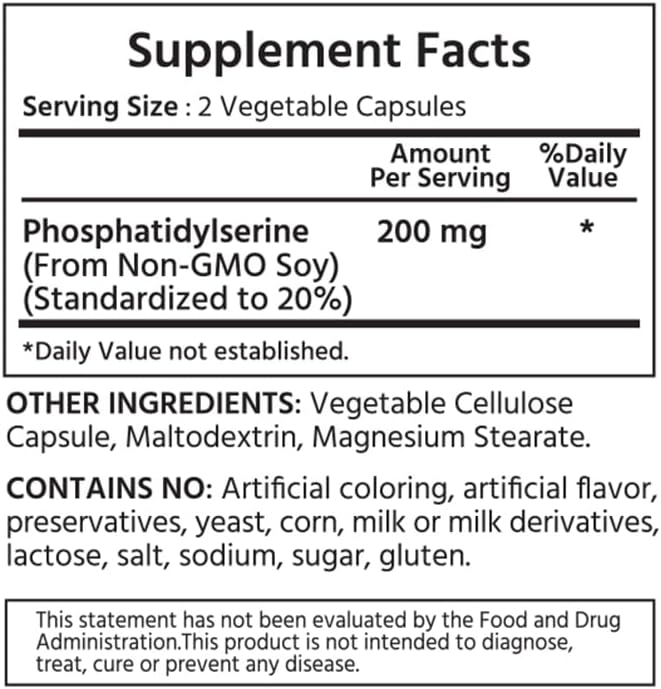 - Phosphatidylserine 200 mg: Each serving provides a standardized 200 mg dose, crafted with naturally derived ingredients to ensure exceptional purity, bioavailability, and absorption. This product is also certified Non-GMO.