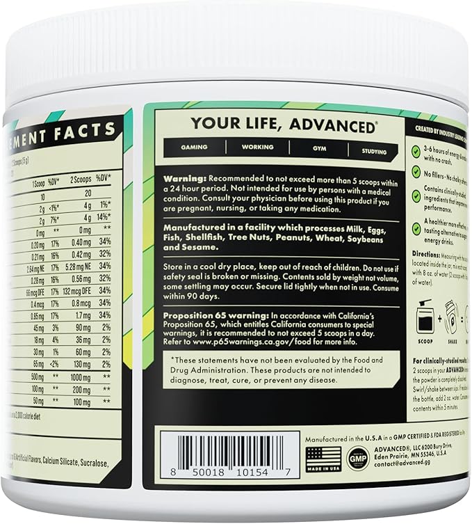 - Optimized Energy Blend - Energy is loaded with ingredients that have been shown to maximize mental clarity and alertness. L-Theanine and All-Natural Caffeine from Green Tea give you an energy boost with no jitters and no energy crash.