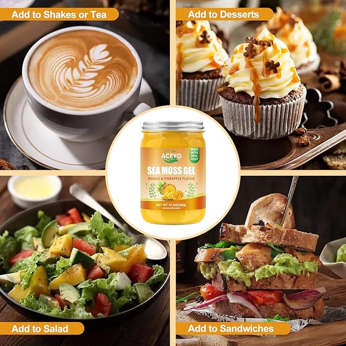 - 🥭🍍【Multiple Ways To Enjoy It】Our Wildcrafted Sea Moss Raw Organic Gel, Has Mango And Pineapple Flavor, Is Great For Smoothies, Shakes, Teas, Juices, Soups And Desserts,Use It As An Ingredient In Your Favorite Salad Or Make Some Sandwiches