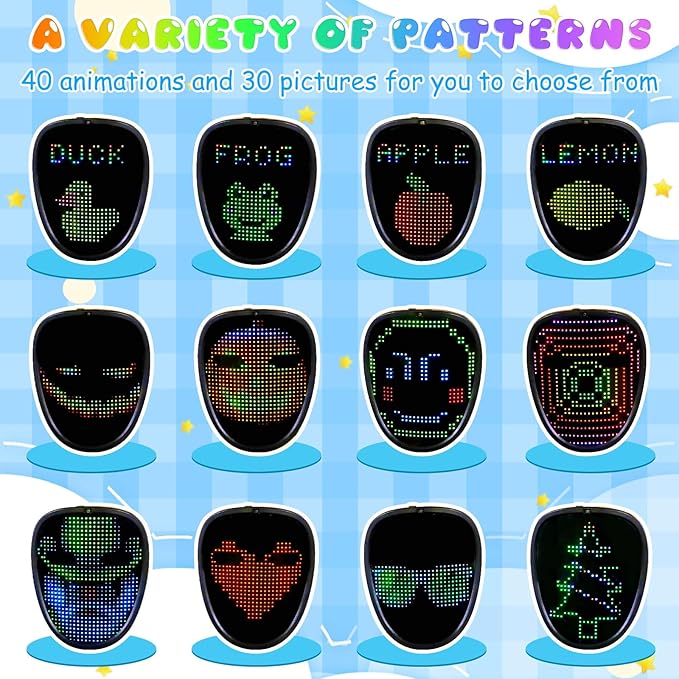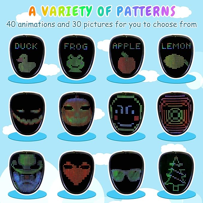 - 70 Patterns Display – Our shining LED mask is a must-have for kids who love to stand out! Built with 70 different display modes (40 dynamic modes and 30 static images), your child can choose any pattern for their own. style for different occasions. LED face mask supports gesture sensing, screen image will change with a wave of the hand.Don't settle for a single functional toys, give your child the coolest LED masks with fun and High playability.