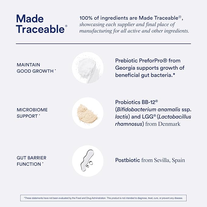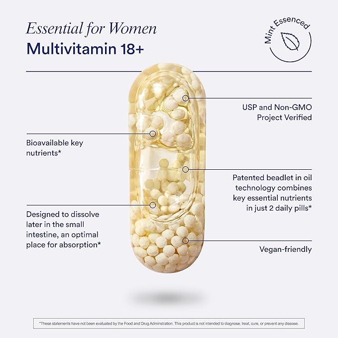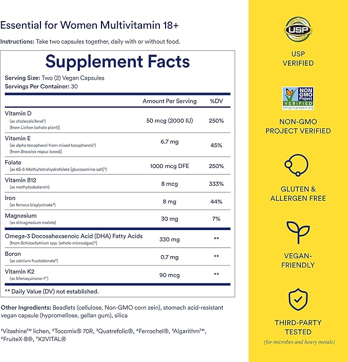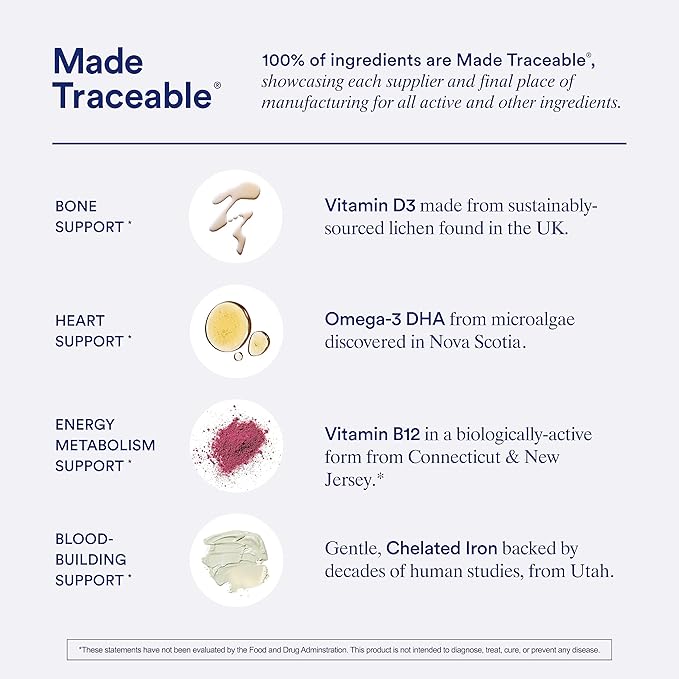 - Made Traceable: Our world-class scientists scoured the globe for high quality ingredients when formulating for Essential for Women 18+. Our Essential Multivitamin for Women 18+ formula includes Vitamin D3 made from sustainably-sourced lichen found in the UK - for bone support and Omega-3 DHA from microalgae discovered in Nova Scotia. Additionally, our Synbiotic formula includes Prebiotics PreforPro from Georgia and Postbiotics Butyrate (as Tributyrin) from Spain.
