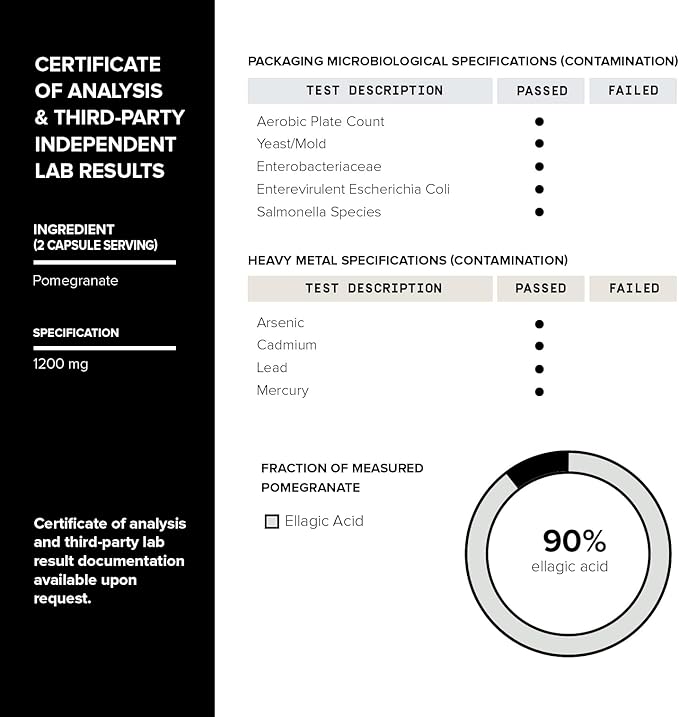 - The Highest Dosage (At the Greatest Value) - Toniiq Pomegranate Extract brings some of the highest levels of potent cellular health-promoting benefits on the market. Our Pomegranate extract contains an unmatched 90% ellagic acid content, while other urolithin a pomegranate supplements contain less than 40%.