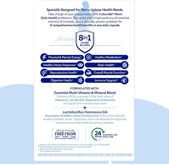 - SAFE and BACKED BY RESEARCH: Over 1,000 scientific studies and 30 years of research have demonstrated the safety and efficacy of Lactobacillus rhamnosus GG probiotics. Culturelle Men’s Daily contains no gluten, milk, soy or preservatives