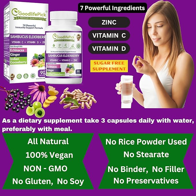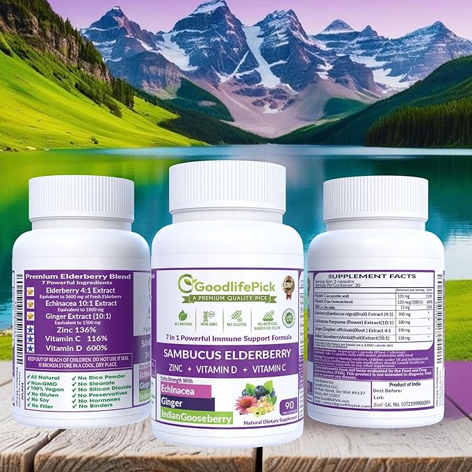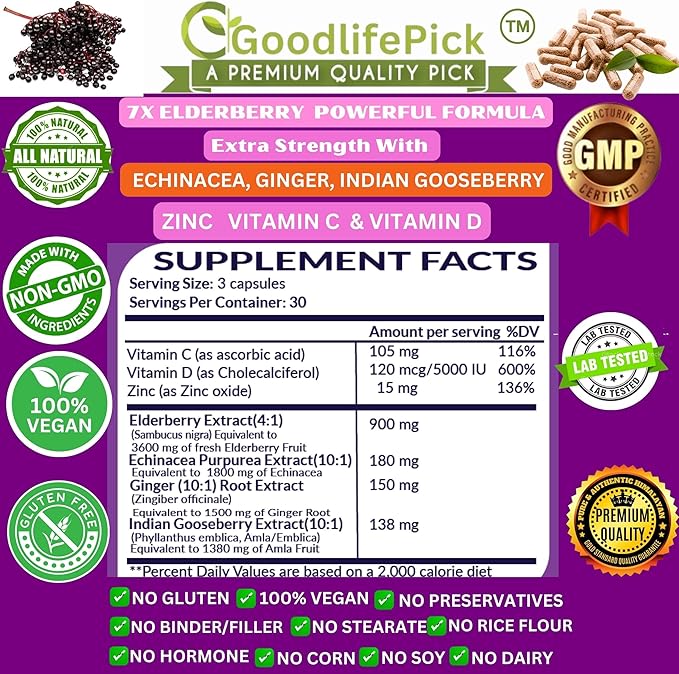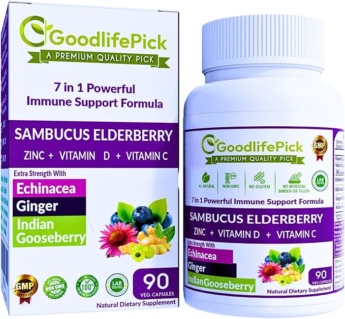 - ** GOODLIFEPICK - 7X POWERFUL IMMUNITY SUPPORT FORMULA WITH POWERFUL ANTI-OXIDANTS - Elderberry blended Echinacea, Indian Gooseberry (Amla), and Ginger add Extra Strength to Elderberry Formula that makes it best available Elderberry Immune Support Formula