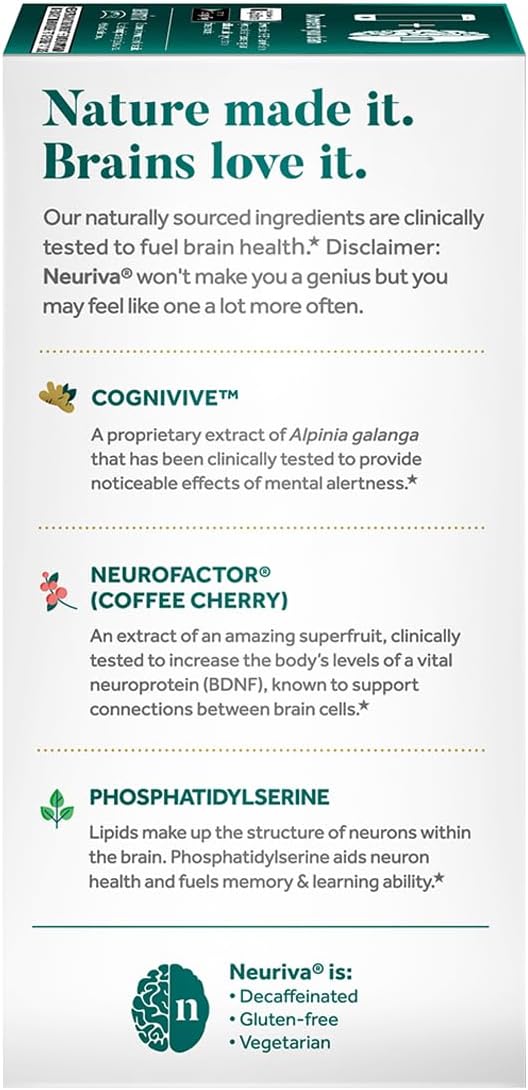 - BRAIN HEALTH SUPPORT FOR ADULTS: Neuriva Ultra contains clinically tested, naturally sourced, ingredients like as CogniviveTM, NeurofactorTM plus Phosphatidylserine, and B Vitamins which, together, promote cognitive function and support memory and focus.