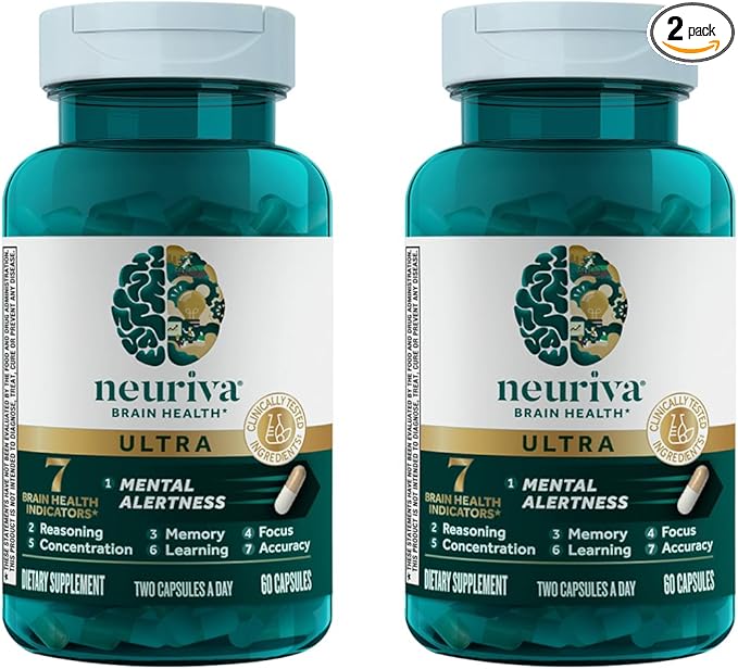 NEURIVA Ultra Brain Supplement for Mental Alertness, Memory, Focus & Concentration with Clinically Tested Cognivive, Neurofactor, Phosphatidylserine, Vitamins B6 & B12, 60 Count Capsules (2 Pack)
