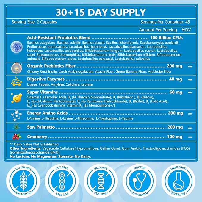 - Gut Health for Men: Combine the power of 100 Billion CFUs probiotics from 20 strains, prebiotics, enzyme, amino acids, saw palmetto and vitamin B complex to create an all-in-one gut health solution that’s easy and effective. High-potency probiotic offer 90 capsules in a shelf-stable bottle and 50 Billion CFUs in each capsule, you can adjust the dosage if you need, so the serving size is 45 days and even more. Your well-being begins from the gut, please arm it with our cost-effective probiotics.