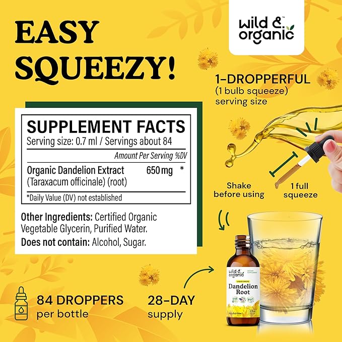 - 28-Day Supply: Each 2 fl. oz. bottle of Wild & Organic dandelion root drops contains 84 servings per bottle, providing a 28-day supply when taken three times per day.