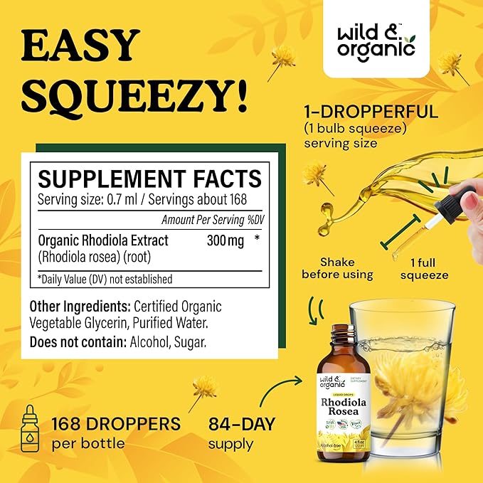 - 84-Day Supply: Each 4 fl. oz. bottle of Wild & Organic rhodiola tincture contains 168 servings per bottle, providing an 84-day supply when taken two times per day.