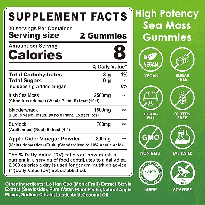 - ✌️ Immune Support & Thyr0id Health: Green chewable sea moss gummies provide your immune system with a boost and increase natural body defenses all year round. Bear gummies are carefully crafted to blend with bladderwrack to improve nutrient absorption by 30%, which is good for supporting the thyr0id. It is recommended 2 gummies a day. 30 days Supply. Add our apple flavor sea moss dietary supplements to your table choices to help you stay strong!