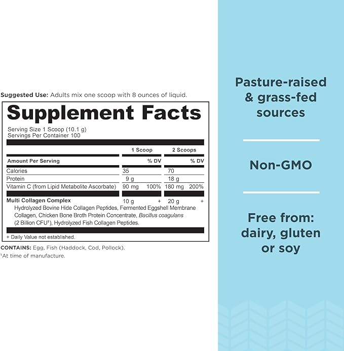 - Contains 10 types of collagen from 4 real food sources - beef, chicken, fish and fermented eggshell membrane; Delivers full-body benefits for healthy hair, skin, nails, joints and gut.