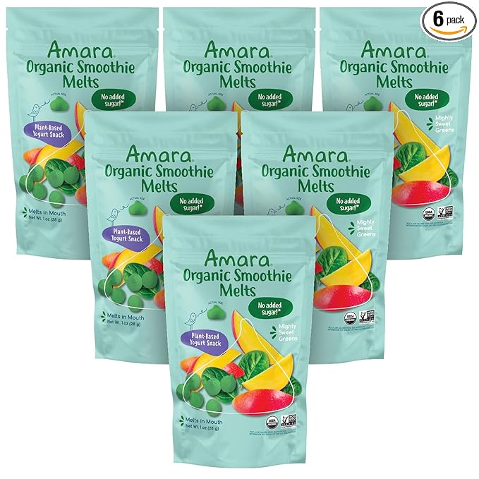 Amara Smoothie Melts - Mighty Sweet Greens - Baby Snacks Made With Fruits and Vegetables - Healthy Toddler Snacks For Your Kids Lunch Box - Organic Plant Based Yogurt Melts - 6 Resealable Bags