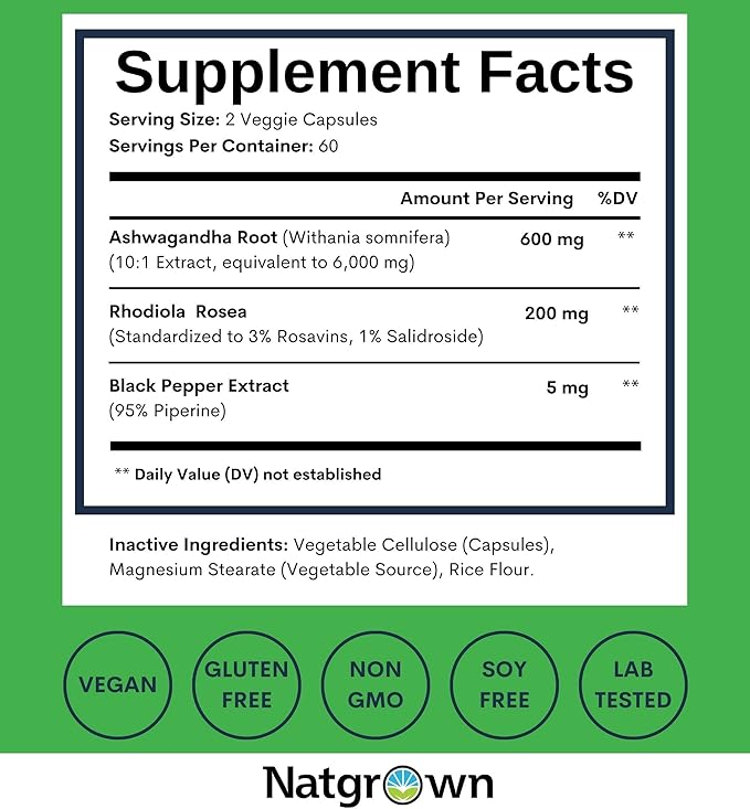 Natgrown Rhodiola Rosea with Ashwagandha Root Extract Capsules - Standardized to 3% Rosavins and 1% Salidroside - 120 Count