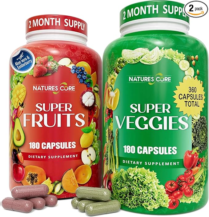 Nature's Core Fruit and Veggie Supplement - 360 Capsules -100% Whole Super Fruit and Super Vegetable Supplements & Vitamin, Made in USA, Soy Free, Vegan- (180 Count Pack of 2)