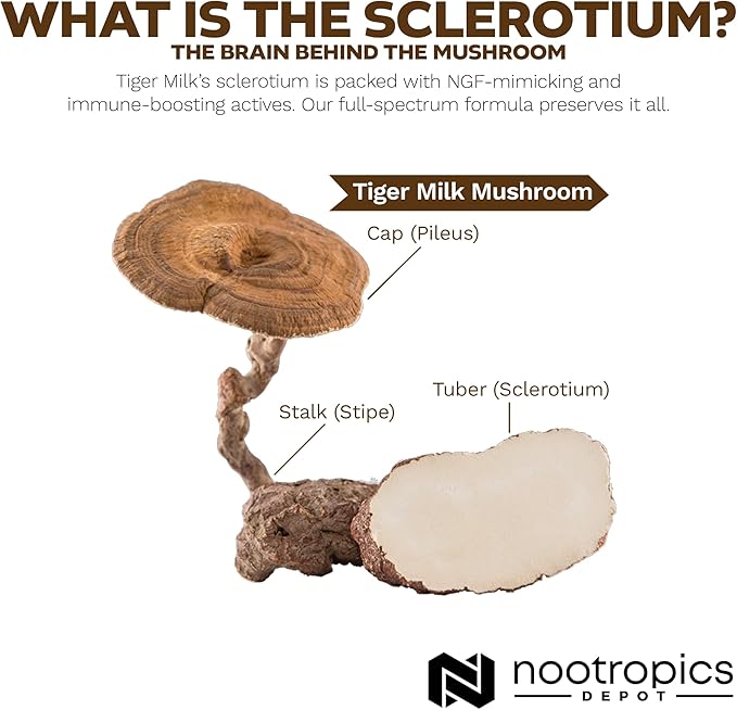 - Cutting-edge Neuroplasticity Boost: Tiger milk mushroom has been gaining rapid popularity in the functional mushroom arena due to recent research demonstrating its ability to enhance neuroplasticity. While lion's mane stimulates neuroplasticity via increased nerve growth factor (NGF), tiger milk mushroom takes a unique approach by directly targeting the NGF receptor. With its NGF mimetic action, tiger milk mushroom is set to revolutionize the functional mushroom landscape.
