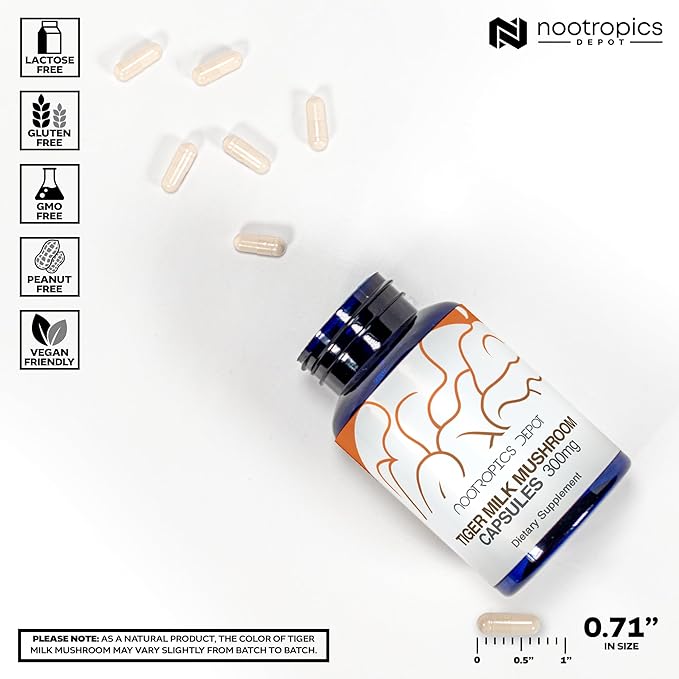 Nootropics Depot Tiger Milk Mushroom Capsules | 300mg | 180 Count | Lignosus rhinocerus Sclerotium | Cognition, Histamine, & Respiratory Support