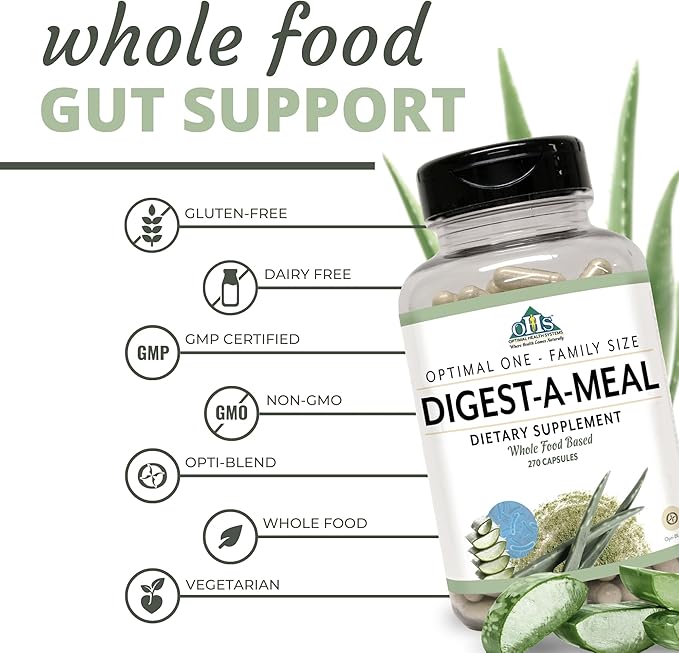Optimal Health Systems Digest-A-Meal | Gut Health Enzyme & Probiotic | Bloating, Acid Reflux, & Indigestion Relief + Aloe Vera Leaf | Digestion Supplement | 270 Capsules Family Size