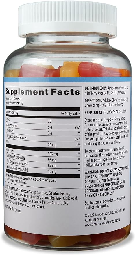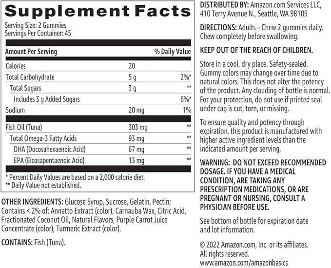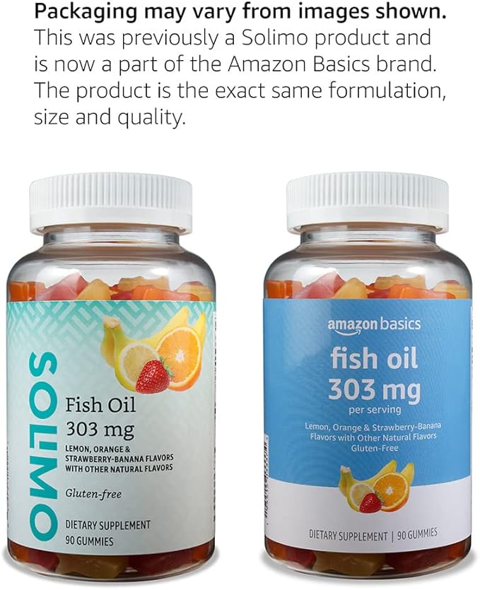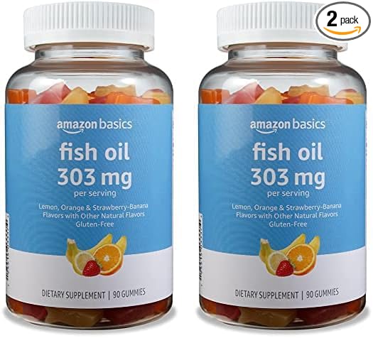 Amazon Basics Fish Oil 303 mg, Lemon, Orange & Strawberry-Banana Flavors, 90 Gummies (2 per Serving), EPA and DHA Omega-3 Fatty acids (Previously Solimo) (Pack of 2)