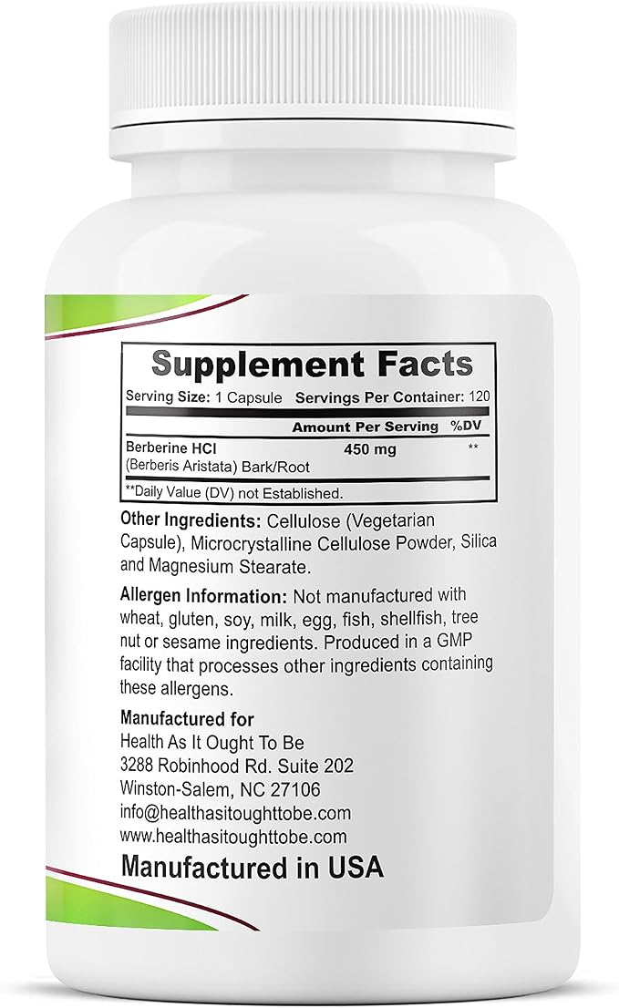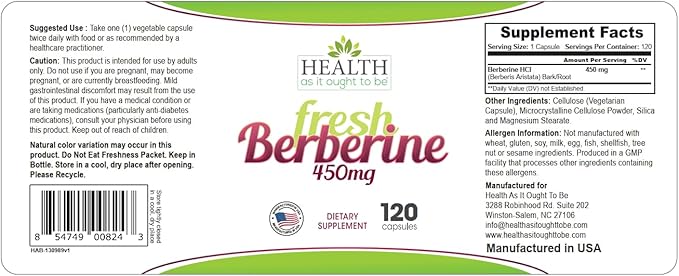 Health As It Ought To Be Fresh Berberine 450mg Supplement | Contains Only Berberine | No Preservatives | 120 Capsules