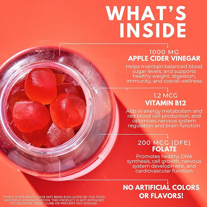 Apple Cider Vinegar Gummies - Sugar Free Apple Cider Gummies with Vitamin B12 and Beetroot Powder - Vegan, Non-GMO & Gluten-Free, Made in USA (30 Servings)