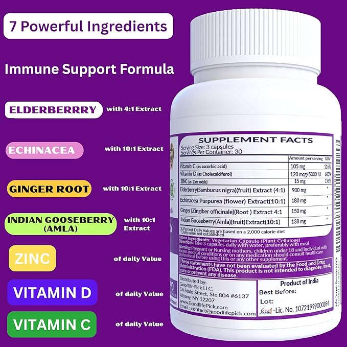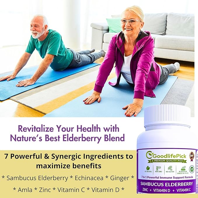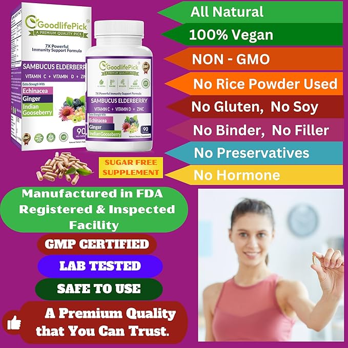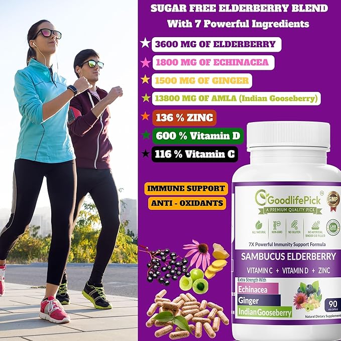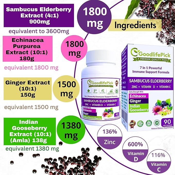 - GOODLIFEPICK - 7X POWERFUL ELDERBERRY FORMULA WITH POWERFUL ANTI-OXIDANTS - Blended Echinacea, Indian Gooseberry (Amla), and Ginger offer Elderberry an Extra Strength and make this formula a Stronger Anti-Oxidant due to their own capabilities.